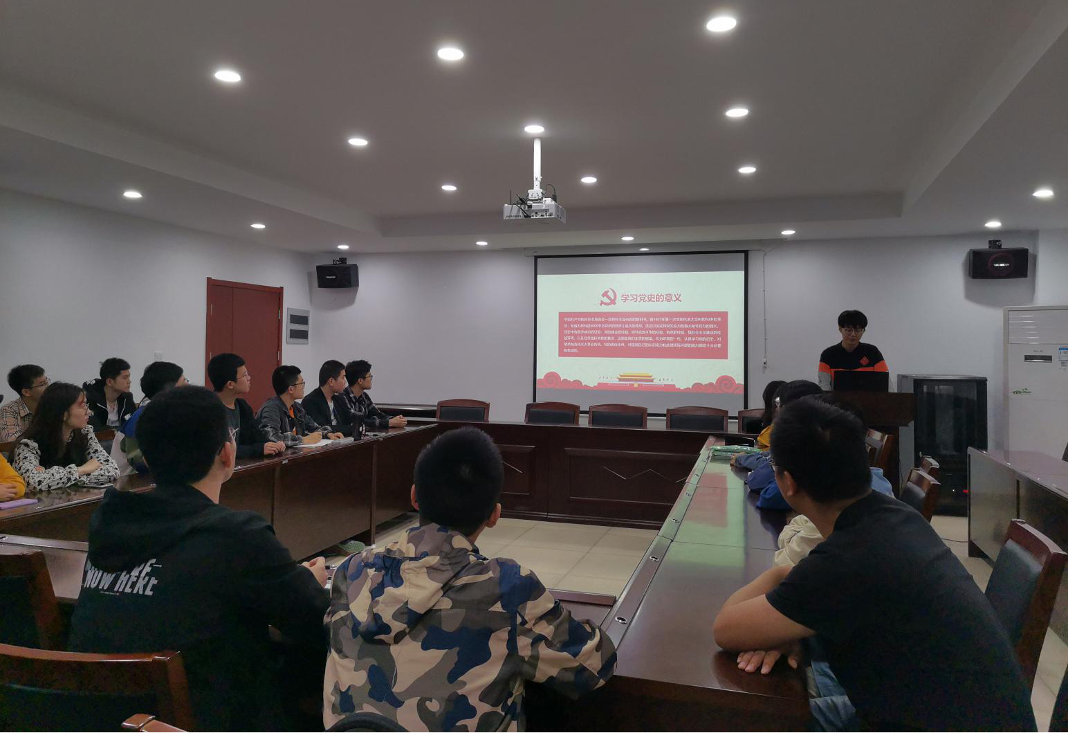 本次活动以支部书记上党课的方式展开。首先支部书记高在壮介绍党史学习的重要意义作为年青的一代,认真学习党的历史,对继承和发扬光大革命传统、党的优良作风,对提高自己的认识能力和处理实际问题的能力都是十分必要和有益的。随后高在壮介绍一些党的重大历史事件,从历史中看到共产党人坚定的理想信念,凝练出英勇奋斗,忘我牺牲的党性修养。最后呼吁大家在和平年代,要不忘历史,为党完成新世纪的三大任务尽自己的一份力。