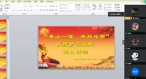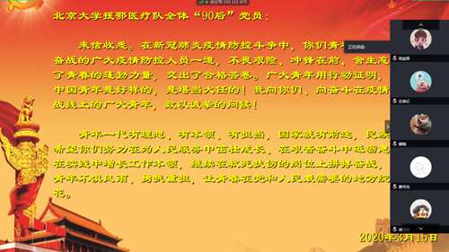 5月2日下午两点半,​tyc122cc太阳成集团研究生第一党支部线上开展了以“青山一道,共担风雨”战疫护国主题党日活动。本次党日活动主题由党支部书记带领支委共同拟定,主要分为四个部分:学习习近平总书记关于新冠疫情防控的系列重要讲话、观看武汉抗疫纪录片《见证》、学习《习近平给北京大学援鄂医疗队全体“90”后党员的回信》、全体党员进行交流探讨四个部分。