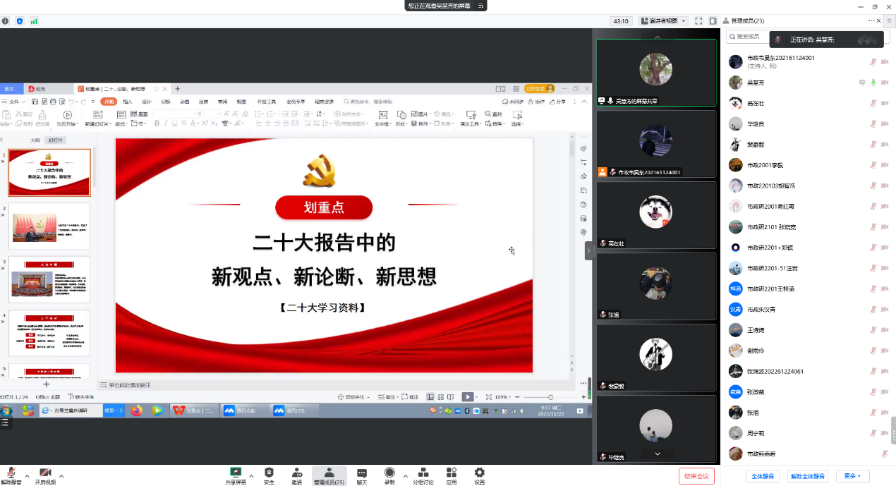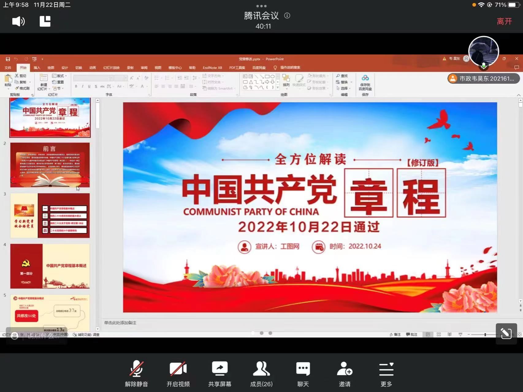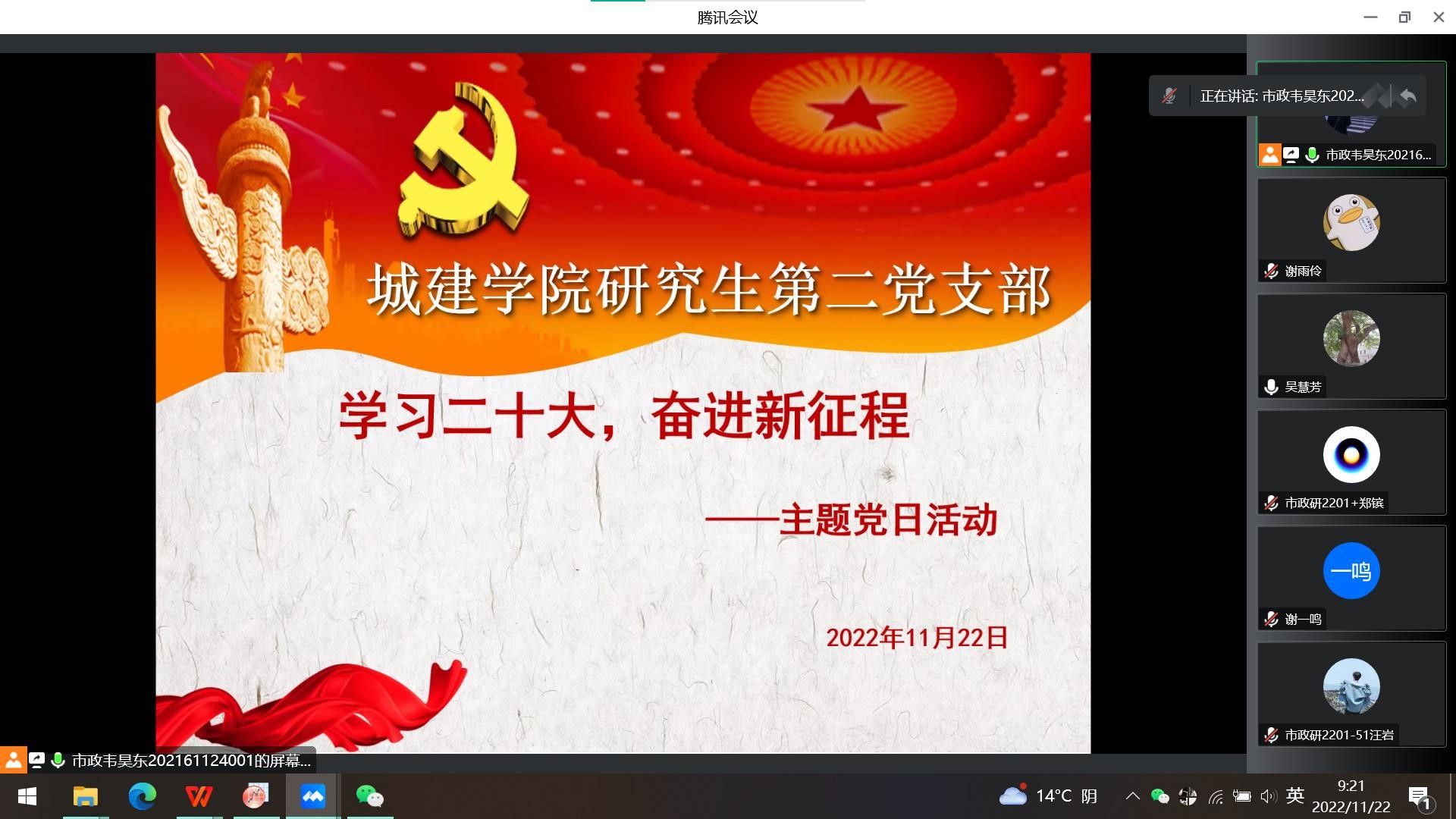 tyc122cc太阳成集团市政研究生党支部于11月22日举行在线会议,学习党的二十大报告和大会通过的《中国共产党章程(修正案)》,激励支部党员增强政治自觉思想自觉行动自觉,把思想和行动统一到党的二十大精神上来。本次活动支部全体党员参加。