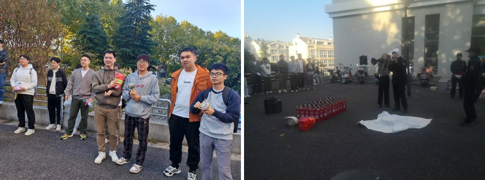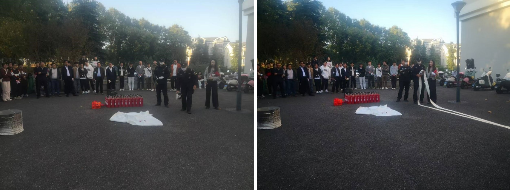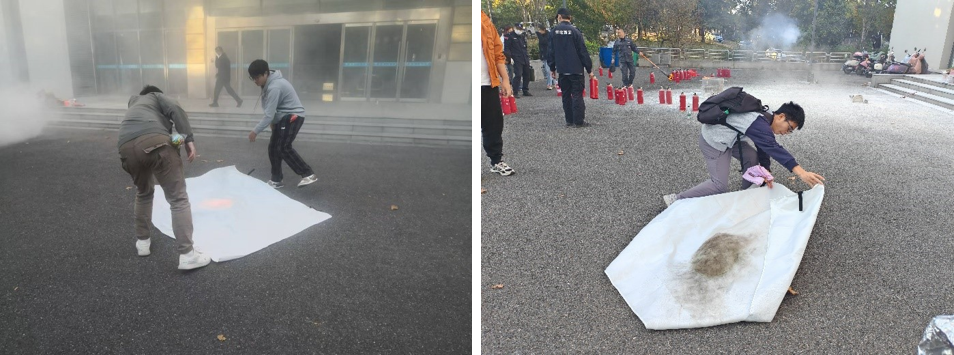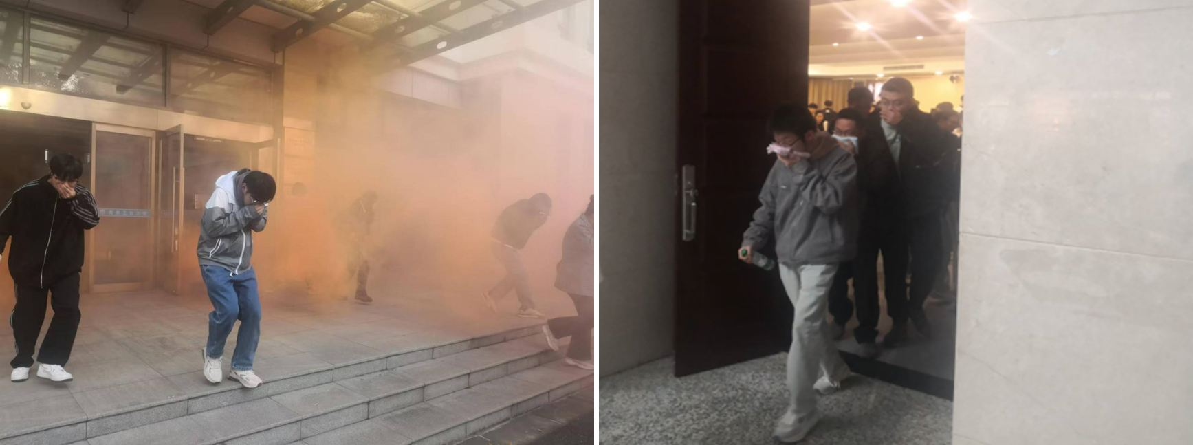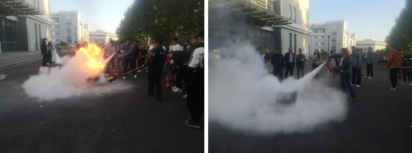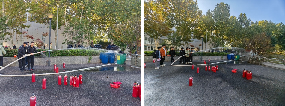 会后,公司党委保卫处消防科科长张思宇主持消防演练活动,在立德楼前广场模拟浓烟四起,同时消防警报声响起,六院师生代表在指挥下有序疏散,开展消防演习。在消防实操演习前,开展了消防知识趣味问答环节,与会人员积极参加,气氛热烈。消防实操演习环节包括正确佩戴消防防毒面具、规范使用消防水带灭火毯和灭火器等,最后还进一步让师生实操消火栓喷水演练。