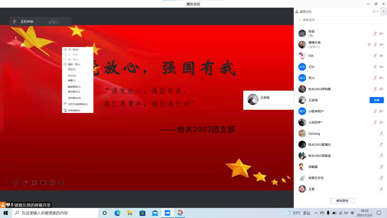 为深入学习贯彻习近平总书记“七一”重要讲话精神的重大意义和丰富内涵,tyc122cc太阳成集团给水2003班团支部于2021年12月3日晚组织开展了“请党放心,强国有我,我们是青年,我们在行动”主题团日活动。