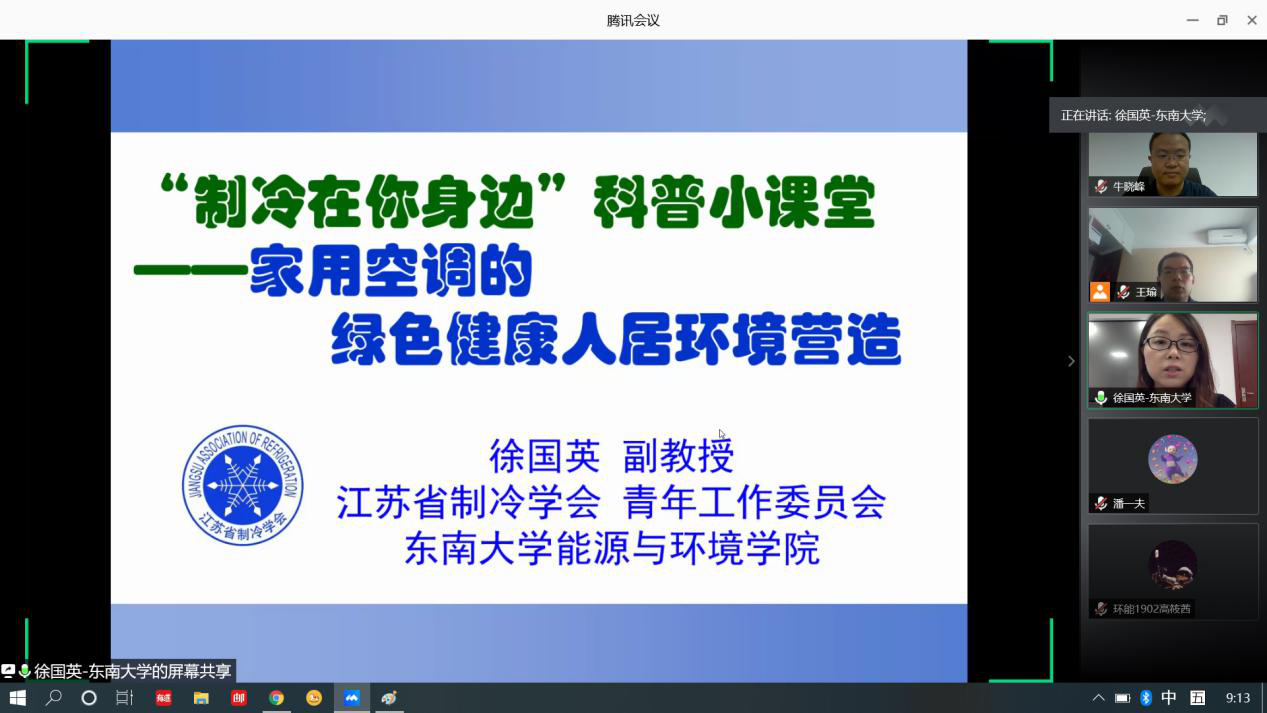 7月16日上午九暑期社会实践活动正式启动,牛老师和王老师首先进行了实践动员,再次强调了实验意义。随后江苏省制冷学会青年工作委员会副主任委员、东南大学徐国英副教授应邀在腾讯会议为同学们开展了题为“‘制冷在你身边科普小课堂——家用空调的绿色健康人居环境营造的线上主题讲座。徐国英老师从空调的理论原理和绿色健康空调使用常识两大方面为同学们进行了详细讲解讲解过程包括制冷与空调之间的关系,家用空调“四大件”,环保制冷剂的百年发展历程,家用壁挂式空调清洗的具体操作等等知识,让同学们对空调有了更深入的了解。讲解结束后,同学们积极提问关于空调及个人发展的问题,徐国英老师一一耐心解答,同学们收获颇丰。最后,由牛晓峰老师和王瑜老师主持本次讲座总结,明确本次实践活动的后续计划,为之后线下暑期实践活动的开展做准备。