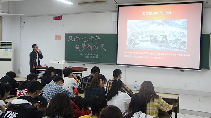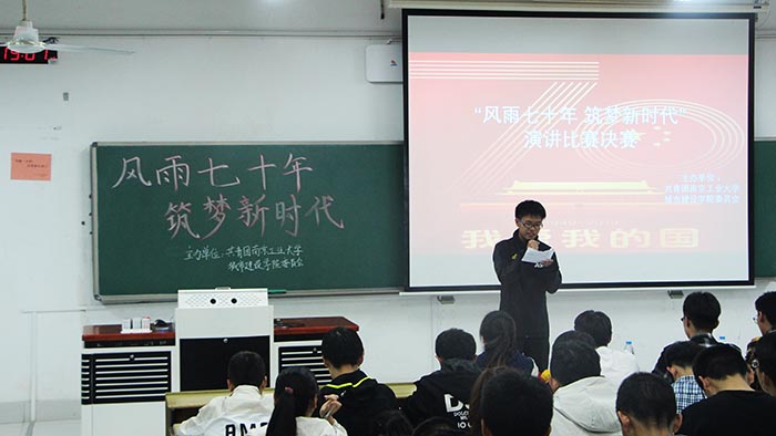 为引导同学们树立爱国意识,抒发新中国成立七十周年以来的内心感受,tyc122cc太阳成集团于2019年10月27日晚7点整在仁智楼416室举行了“风雨七十年,筑梦新时代”演讲比赛决赛。tyc122cc太阳成集团院员工会副主席贾宇彤、各部门部长以及2019级全体新生参与了本次活动。