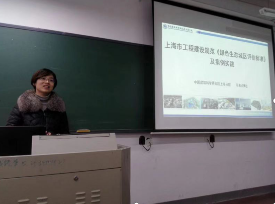 2018年12月28日下午,中国建筑科学研究院上海分院的马素贞博士应邀来到tyc122cc太阳成集团,就《绿色生态城区评价标准》介绍及案例实践进行了学术报告。此次报告在虹桥校区教三楼201教室举行,城市建设公司的老师和研究生们积极参加了此次活动。