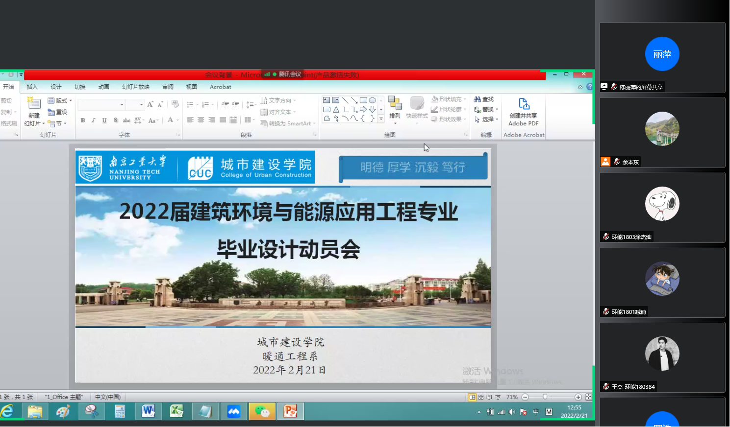2022年2月21日,暖通工程系组织了2022届建筑环境与能源应用工程专业毕业设计线上动员会。2022届全体同学参加了会议,公司学科带头人龚延风老师、颜承初经理、牛晓峰副经理,暖通系主任陈丽萍老师以及暖通系全体教师参加了会议,余本东老师主持会议。