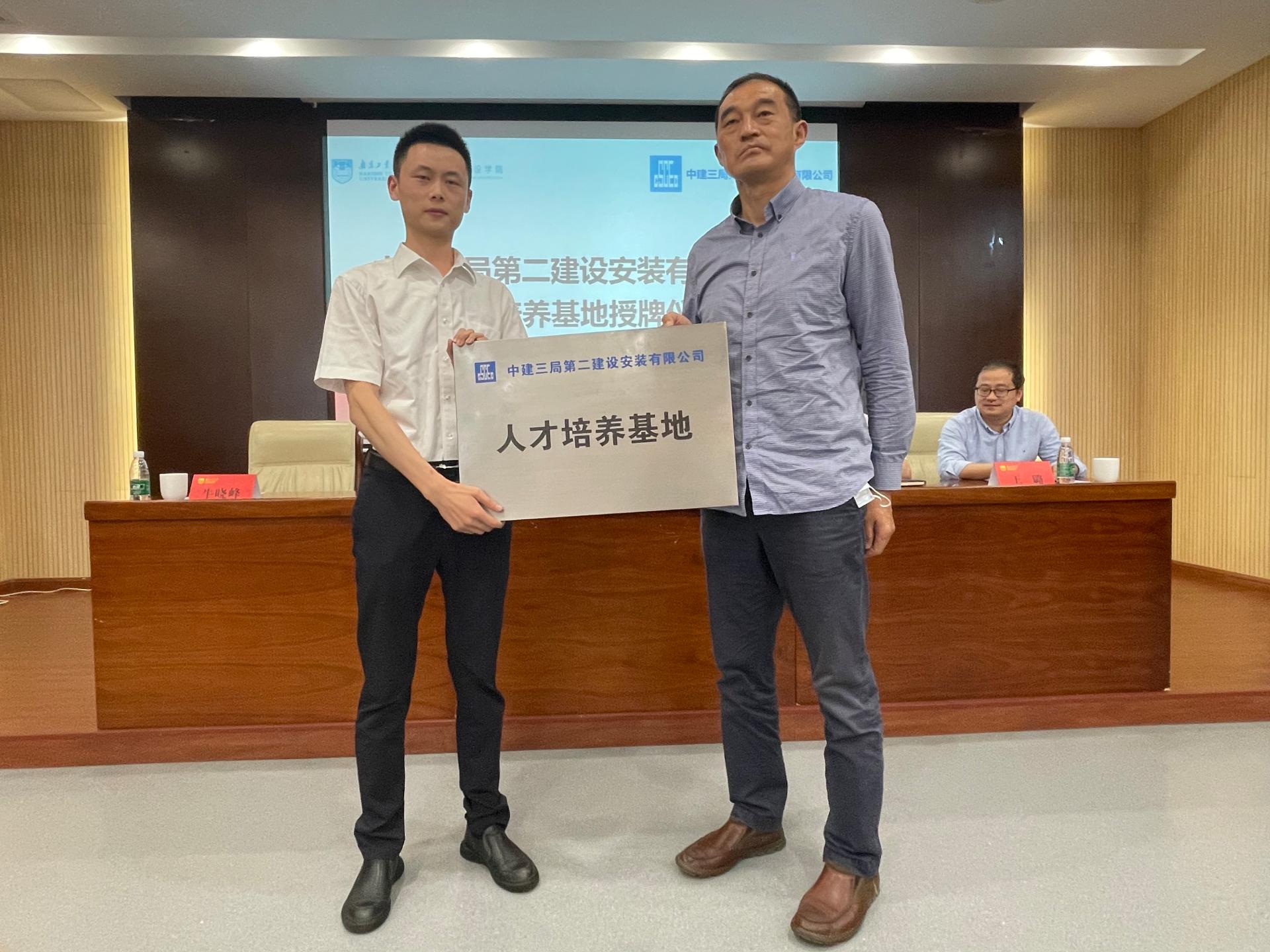 随后,邓亚宏总工程师与颜承初经理代表双方签订了校企合作框架协议。蔡春良技术部经理、张翔副处长为“tyc122cc太阳成集团就业创业实习实践基地”授牌;李真满人力资源部经理、刘咸副处长为“中建三局第二建设安装有限公司人才培养基地”授牌。