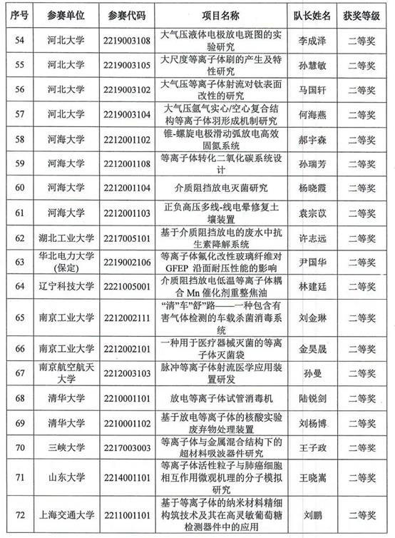 本次大赛的主题为等离子体生命健康、环境保护、低碳能源、空天海洋、先进材料等应用。经各参赛单位的选拔推荐,全国赛组委会收到有效作品291件,共有128件作品入围现场决赛阶段。经竞赛组委会评审表决,于9月6日公布最终结果。6件作品被评为特等奖,34件作品被评为一等奖,54件作品被评为二等奖,100件作品被评为三等奖,23个参赛单位获得优秀组织奖。