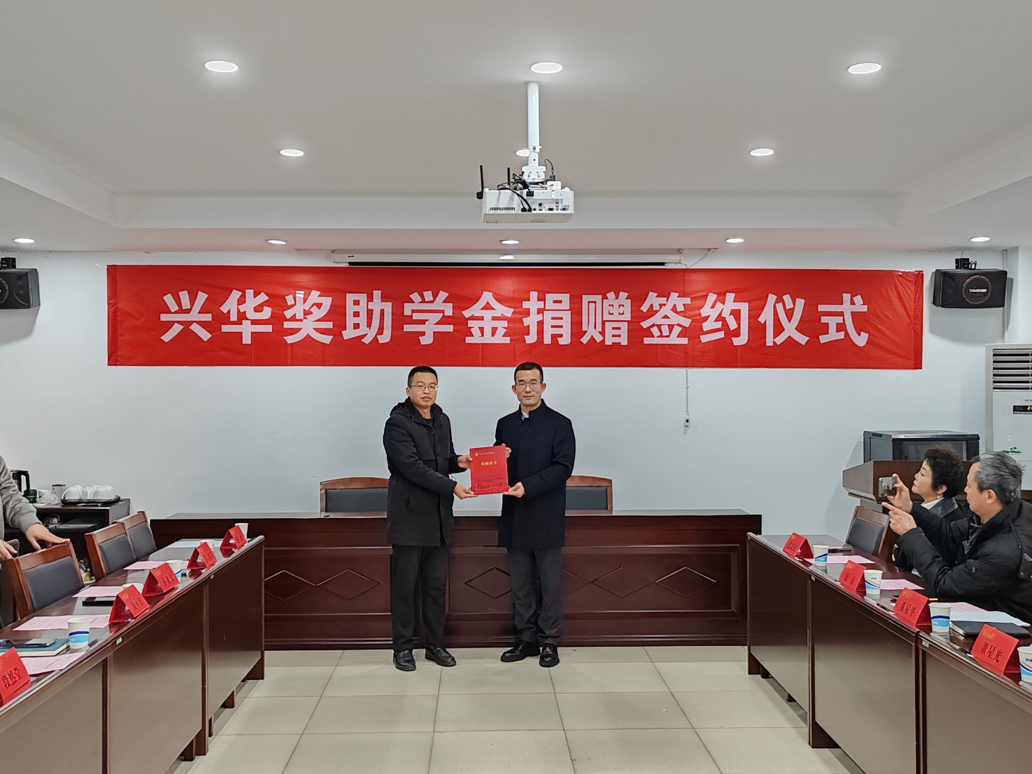 1月5日下午,公司在天工楼302A会议室举办兴华奖助学金捐赠签约仪式。江苏兴华教育科技有限公司董事长董星华、总经理董星光及民盟江苏省委直属文化第一支部与南京市徐州商会相关代表,对外合作与发展处副处长凌红,公司党委书记段然堂、经理颜承初、党委副书记孙家文与公司师生代表参加活动。