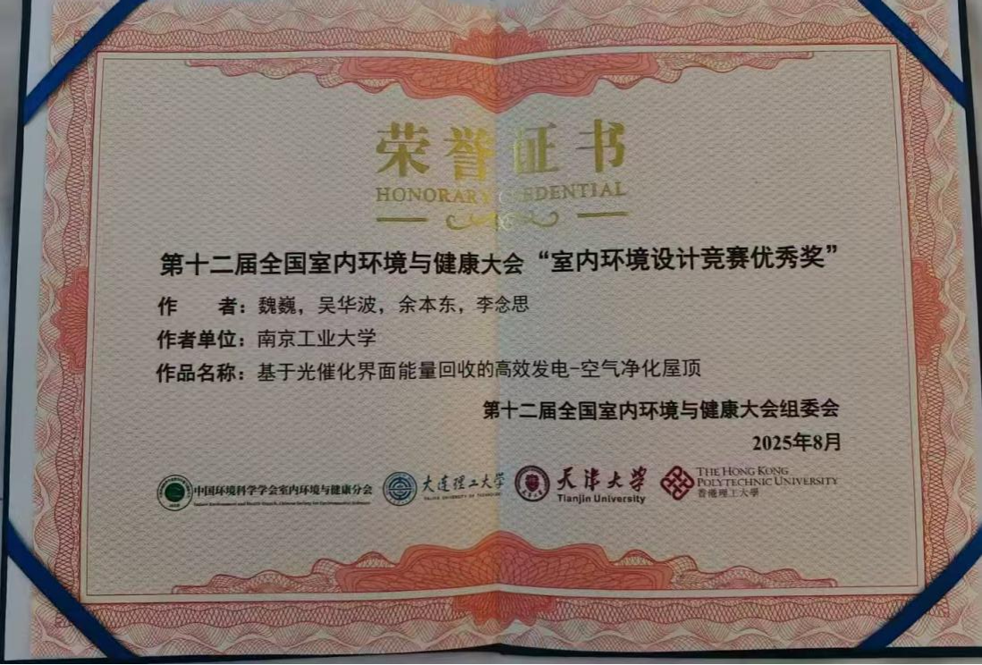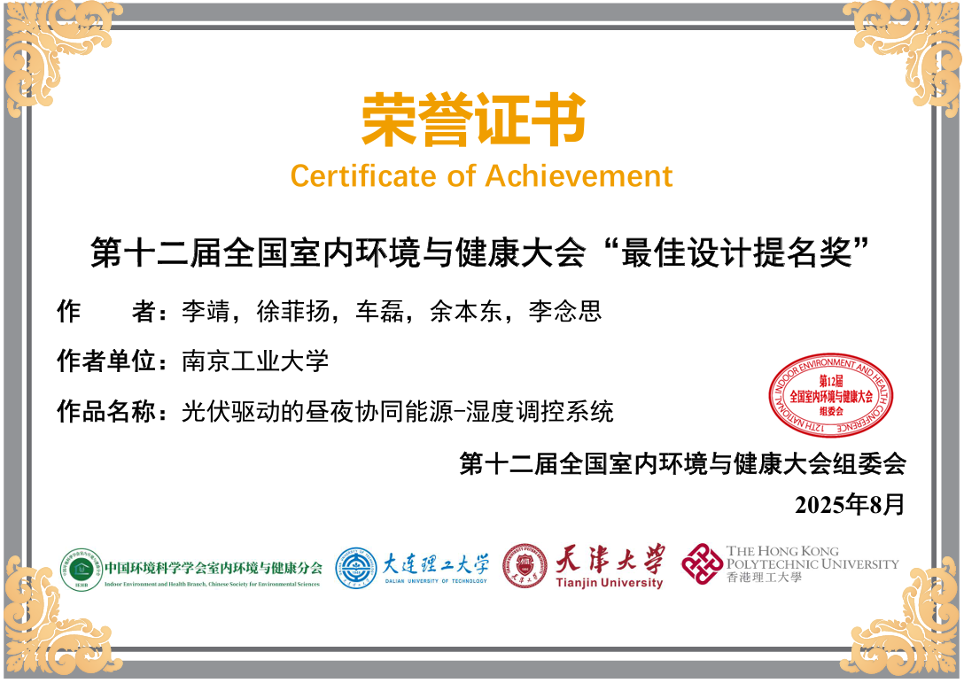 近日,第12届全国室内环境与健康大会圆满落幕。经过网络评审、现场答辩等环节,公司余本东教授指导的员工作品《光催化界面能量高效回收机理及建筑集成研究》(参赛员工:魏巍、吴华波)、《光伏驱动的昼夜协同能源-湿度调控系统》(参赛员工:李靖、徐菲扬、车磊)分别荣获“室内环境设计竞赛优秀奖”和“最佳设计提名奖”。这是公司首次入围该赛决赛并获奖。